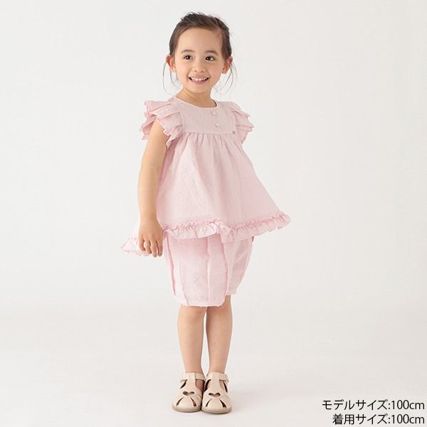 -仕様- 【おすすめの着用時期は春夏シーズン】 【透け感】透けない 【生地の厚さ】普通 【伸縮性】なし 【裏地】あり 【ポケット】なし ※ボトムスにはポケットあり 【アジャスター】なし -素材- トップス:表地:綿100% 裏地:ポリエステル80% 綿20% ボトムス:表地:綿100% 裏地:ポリエステル80% 綿20% -原産国- 中国 -サイズ- サイズ トップス:着丈×身巾×肩巾×袖丈 ボトムス:ウエスト×股上×股下×裾巾 80cm 37×27.5×19.5×5.5 38×23.5×4×17 90cm 39.5×28.5×20×6 40×24×4×18 100cm 43×30×22×6.5 42×26×4×19 110cm 48×29×23×7 44×27×4.5×19 120cm 50×32.5×24.5×8 47×28×5×21 130cm 56.5×34.5×28×8.5 48×29×5.5×21.5