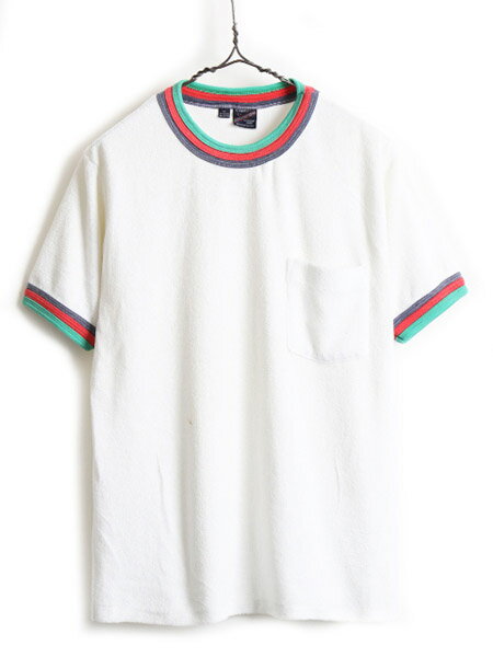 70's USA製 ビンテージ ■ Essley Innovations リブライン ポケット付き パイル 半袖 Tシャツ ( メンズ L ) 古着 70年代 ポケT アメリカ製 | US古着 中古 アメカジ 半袖Tシャツ パイルTシャツ クルーネック カットソー ポケットTシャツ ホワイト マルチカラー 無地 タオル地