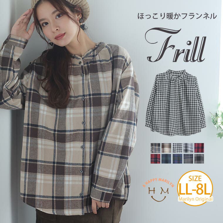 大きいサイズ レディース ブラウス | フランネル チェック フリル ネック ブラウス _ オリジナル シャツ トップス LL 3L 4L 5L 6L 7L 8L 秋 秋物 秋服 冬 冬物 冬服 ぽっちゃり ゆったり かわいい おしゃれ カジュアル プラスサイズ [478049]