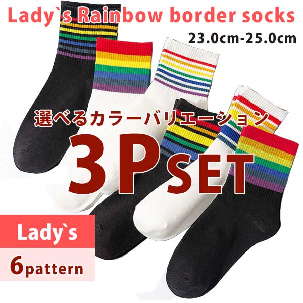 靴下セット 3P SET 3足 選べるカラー 自由選択 ソックス 靴下 レインボー ブラック ホワイト ボーダーソックス スニーカ レディース 23.0-25.0 2Color 3パターン 綿 コットン【9/4 13:59まで限定セールアイテム】