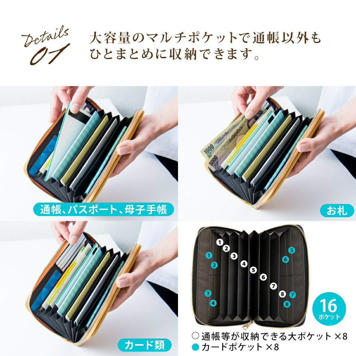 ■カラーイエロー(黄色)ブラック(黒色)ワインレッド(赤色)ブラウン(茶色)グリーン(緑色)ピンク(桃色)オレンジ(橙色)パープル(紫色)ブルー(青色)ホワイト(白色)■サイズ:約12.5×19.5×3.0cm■重量:約240g■素材:牛革■仕様:通帳が収納できる大ポケット×8カードポケット×8 2